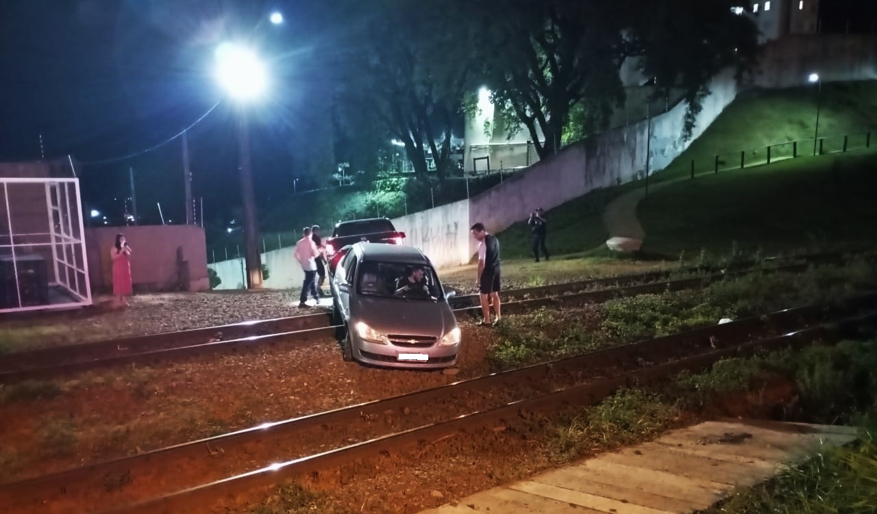 Na noite de sábado (25), um veículo ficou preso sobre os trilhos da linha férrea na Rua Professor Izidoro Luiz Ceravolo, em Apucarana. A Guarda