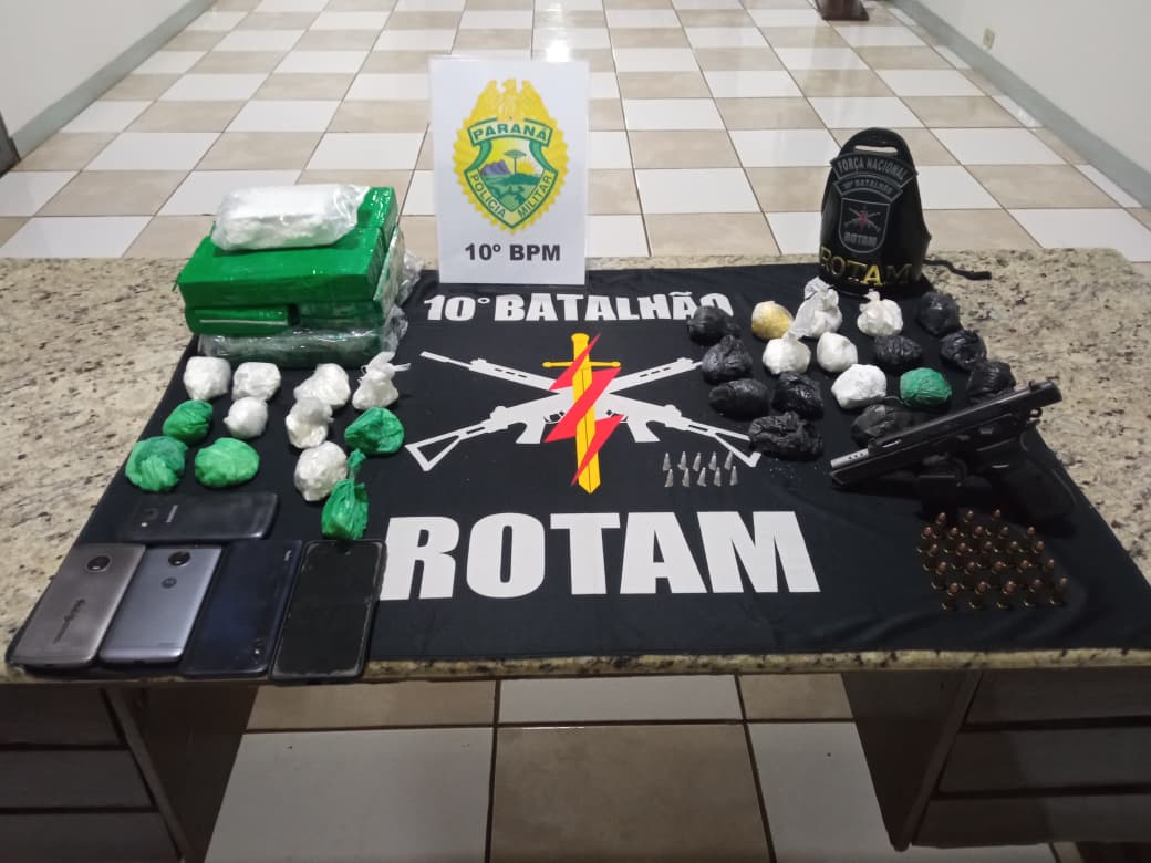 Uma operação conjunta entre equipes de inteligência e radiopatrulha da Polícia Militar resultou na apreensão de grande quantidade de drogas e de uma arma de