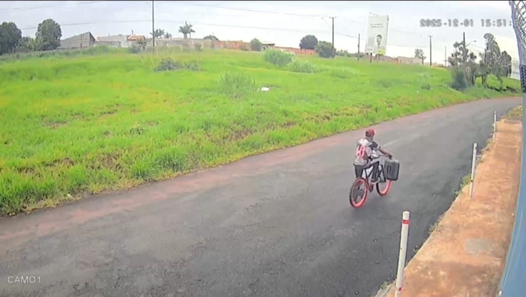 Câmeras de monitoramento registraram, nesta segunda-feira (01), o momento em que um ladrão deixa uma residência carregando diversos objetos furtados e foge em uma bicicleta