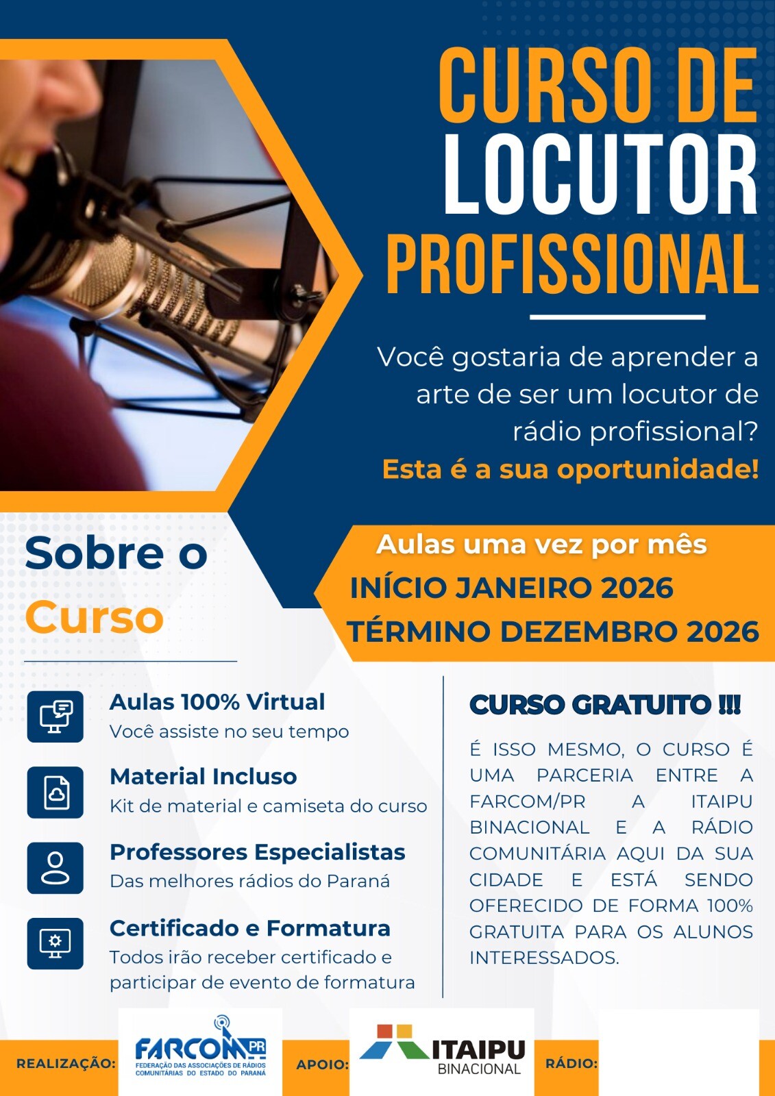 A rádio comunitária de Marilândia do Sul, em parceria com a prefeitura, oferta curso gratuito de Locutor Profissional. As inscrições já estão abertas e devem