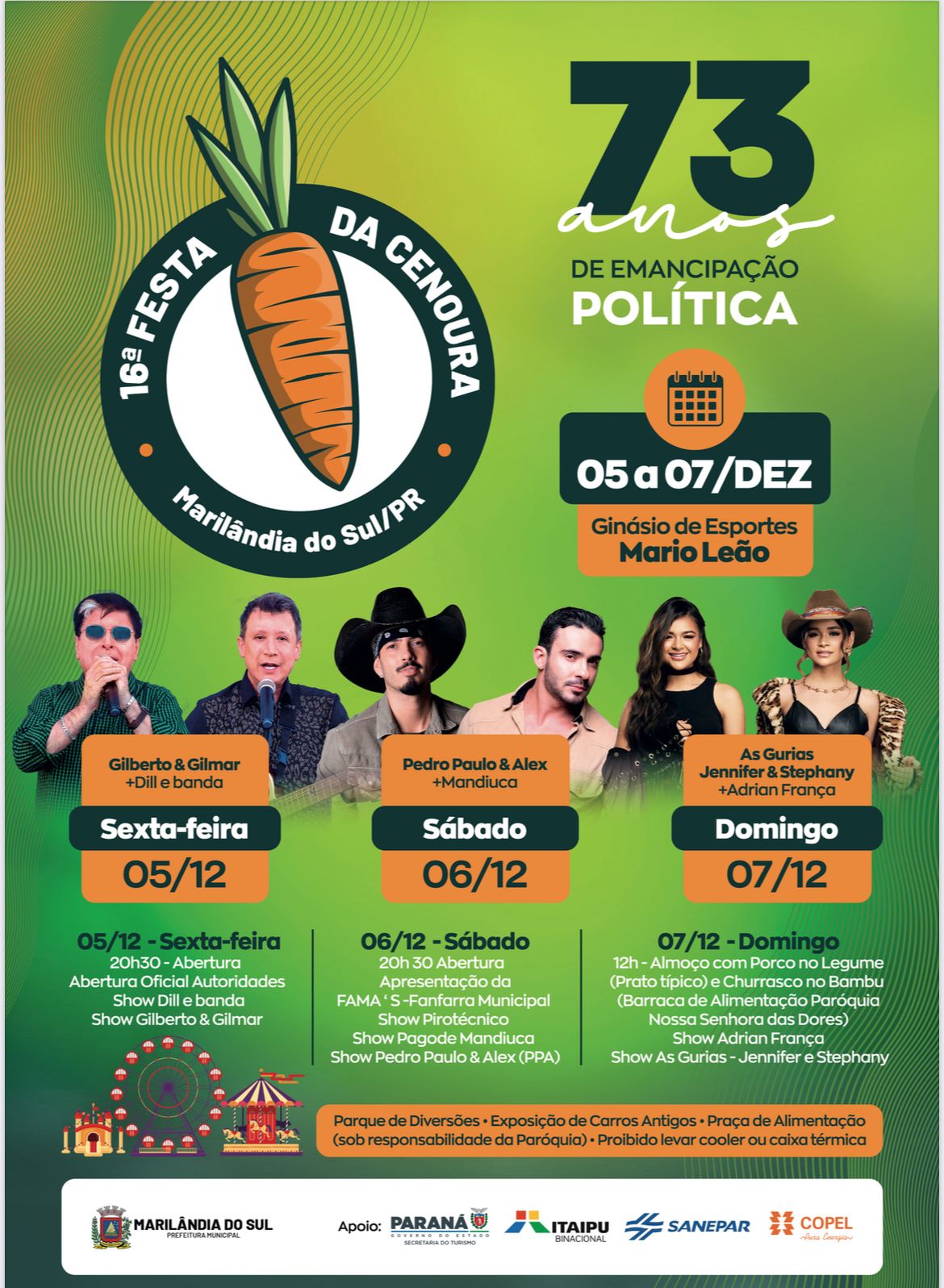 A 16ª edição da Festa de Cenoura de Marilândia do Sul em comemoração aos 73 anos de emancipação política do município começa hoje sexta-feira (5).
