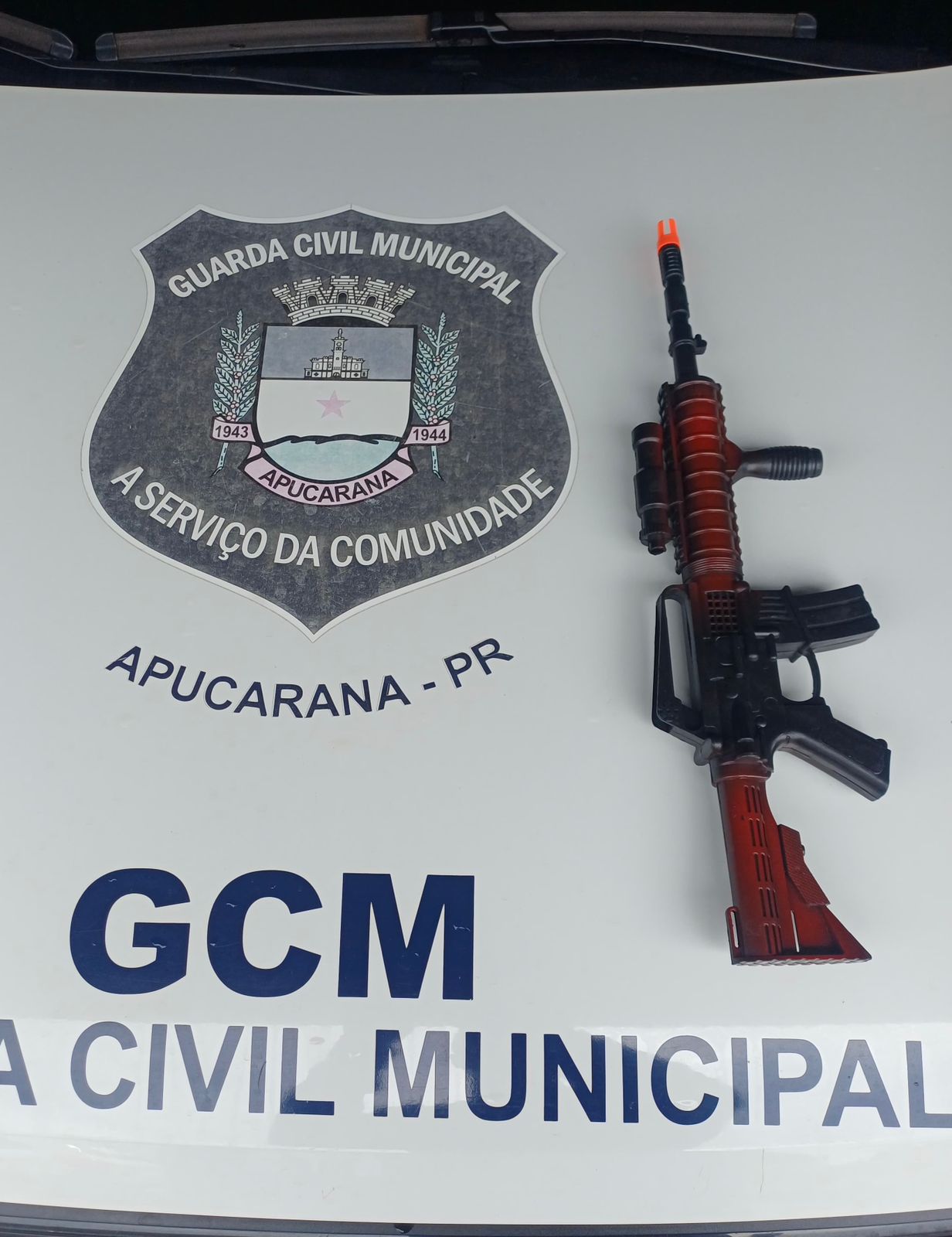 Durante a busca pessoal, os guardas municipais localizaram com os jovens um objeto que imitava um fuzil. Apesar da semelhança visual com o armamento real, a equipe constatou tratar-se de uma arma de brinquedo (réplica).