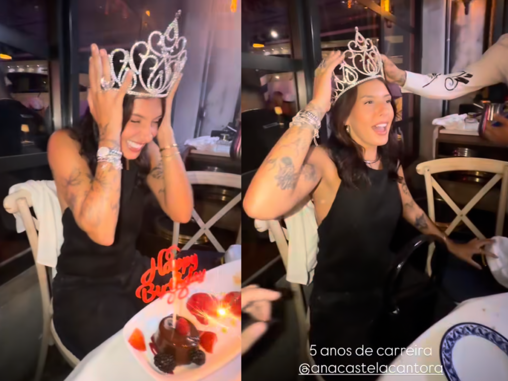 Recentemente, a Boiadeira comemorou cinco anos de carreira em grande estilo em Miami, nos Estados Unidos. A celebração aconteceu em um restaurante com clima de balada, onde amigos da artista participaram da surpresa, acendendo velas em uma sobremesa enquanto cantavam “parabéns”. A cantora compartilhou o momento nas redes sociais, destacando o marco da carreira: “5 anos de carreira de Ana Castela”.