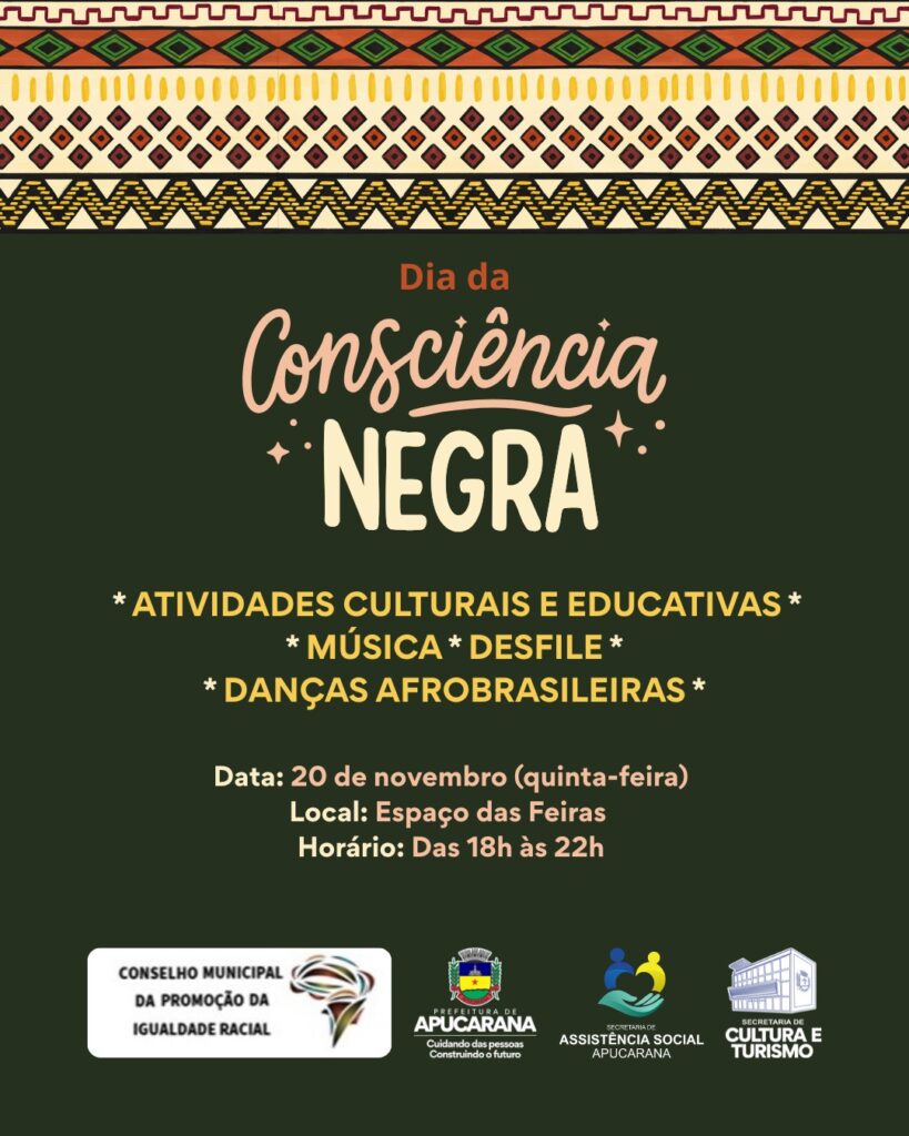 Apucarana se prepara para celebrar o Dia da Consciência Negra, nesta quinta-feira, 20 de novembro, com uma programação especial dedicada à valorização da cultura e da história afro-brasileira. O evento é promovido pelo Conselho de Promoção da Igualdade Racial, em parceria com a Secretaria da Assistência Social e a Secretaria da Cultura.