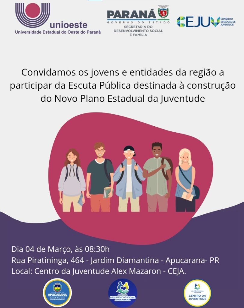 O Conselho Estadual da Juventude, em parceria com a Unioeste e a Prefeitura de Apucarana, promove nesta quarta-feira (4/3) uma escuta pública no Centro da Juventude (CEJA). A iniciativa faz parte do processo de construção do Novo Plano Estadual da Juventude, que definirá políticas públicas voltadas para adolescentes e jovens do estado.