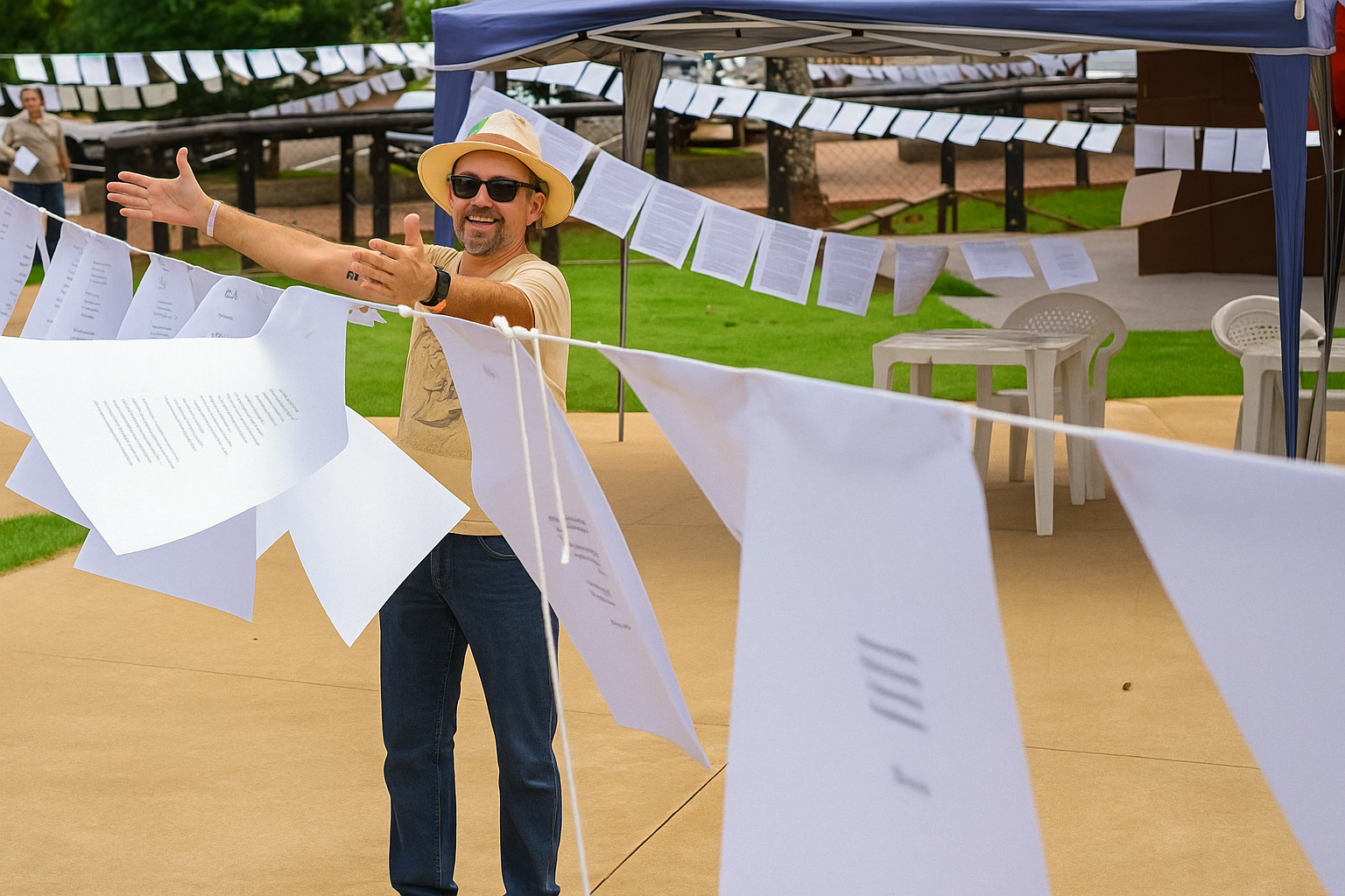 A atmosfera lembrava um festival de sensações. O cheiro de pipoca misturava-se ao som dos risos e às vozes que declamavam. Cada olhar parecia encontrar no varal uma lembrança, uma confissão, uma esperança. Mais do que quebrar recordes, o gesto simbolizou algo maior: o poder da palavra compartilhada. Ali, poesia não estava confinada em livros, mas espalhada ao vento — disponível para todos. E quando o sol se pôs, os papéis ainda tremulavam, como se os versos quisessem permanecer por mais tempo na tarde que se tornara, ela mesma, um poema.