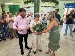 A viúva do homenageado, Aparecida Vicentin Poliseli, esteve presente na homenagem e recebeu, das mãos do Prefeito Rafael Cita, o decreto que nomeia o Sacolão e uma flor da ex-secretária da SESAN, Niele Melo.