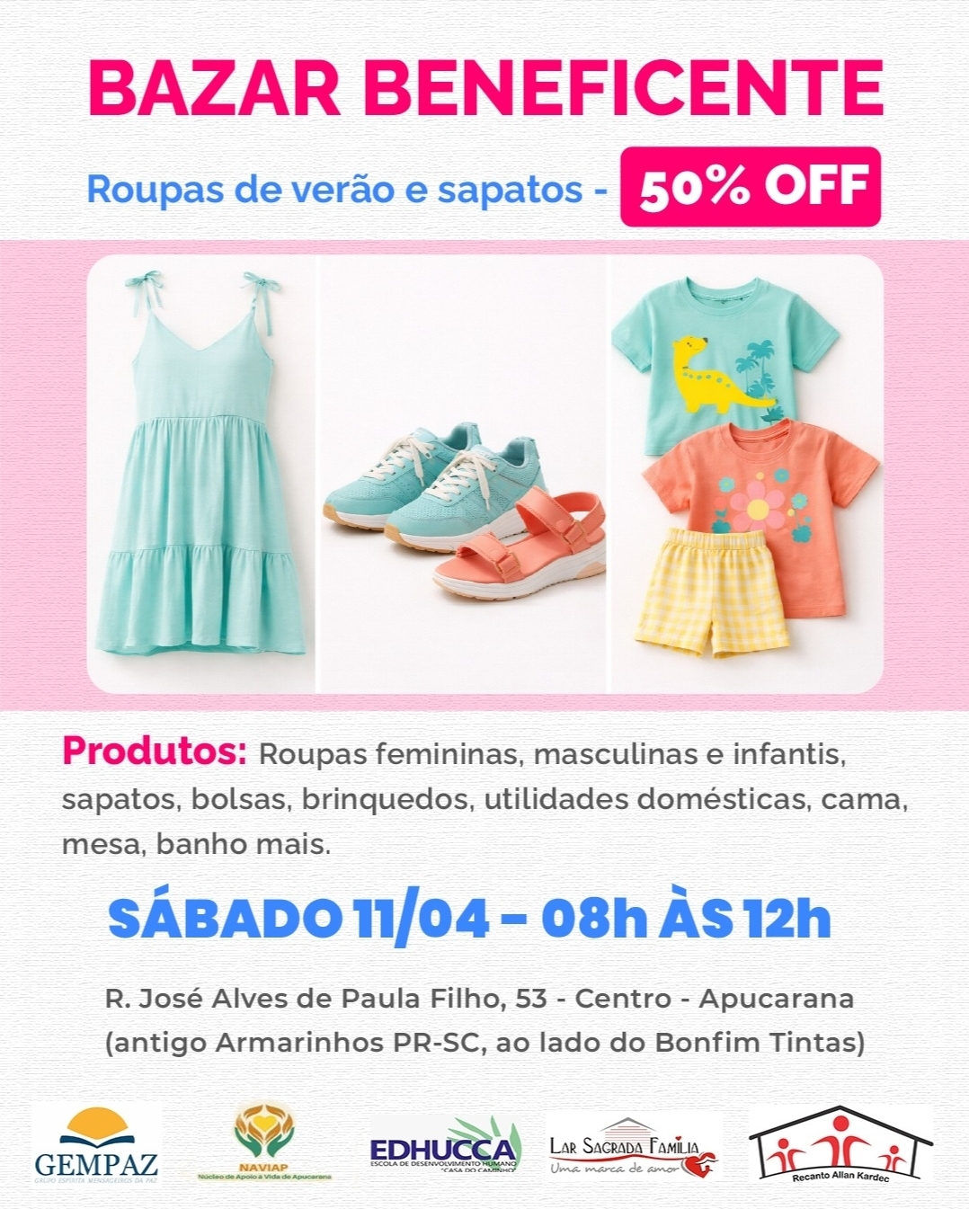 A população de Apucarana tem um convite especial para este sábado (11),participar de um bazar beneficente com diversas opções de produtos e preços acessíveis. Nesta edição, todas as roupas de verão,masculinas, femininas e infantis, além de calçados, estarão com 50% de desconto.