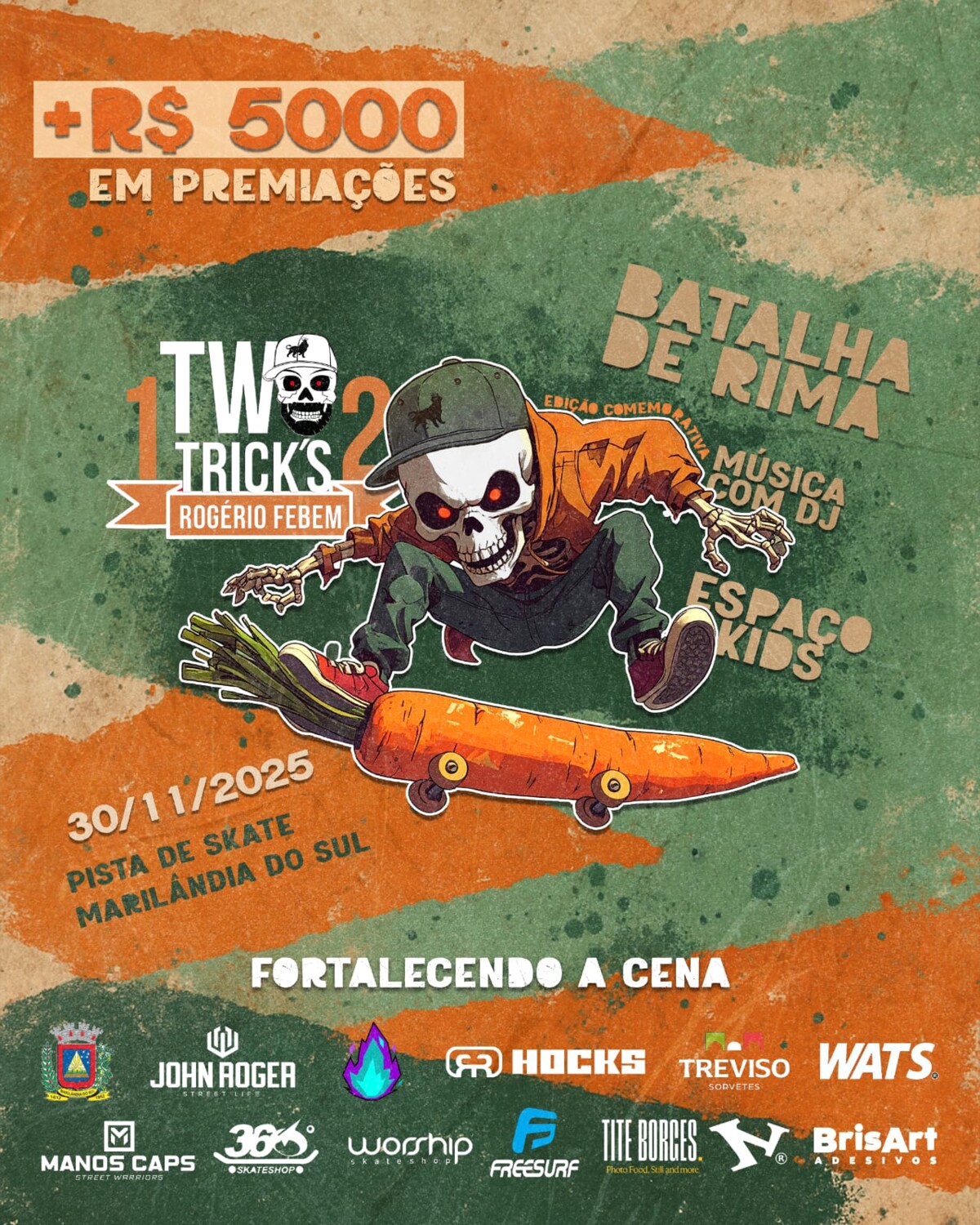 Neste domingo (30), Marilândia do Sul recebe um evento que vai reunir skate e muita música. Será realizada a segunda edição do Two Trick’s. Haverá