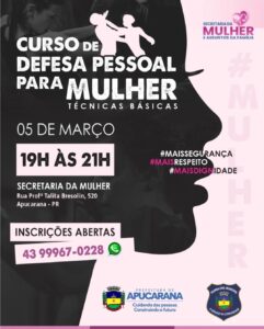 A Secretaria da Mulher de Apucarana está com inscrições abertas para o curso gratuito de Defesa Pessoal para Mulheres, que terá início no dia 05 de março. A iniciativa busca promover mais segurança, confiança e autonomia feminina por meio de técnicas básicas de proteção e prevenção.
