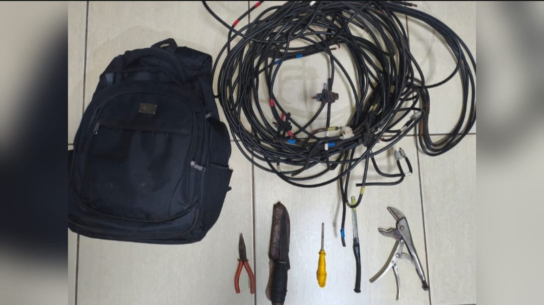 Durante a revista, um dos homens carregava uma mochila com ferramentas como alicate de bico, alicate de pressão, uma serrinha de mão e outros objetos possivelmente utilizados no crime. A equipe retornou ao barracão indicado na denúncia e encontrou no chão a fiação furtada — diversos fios de cobre cortados e enrolados, pertencentes ao padrão de energia do imóvel.