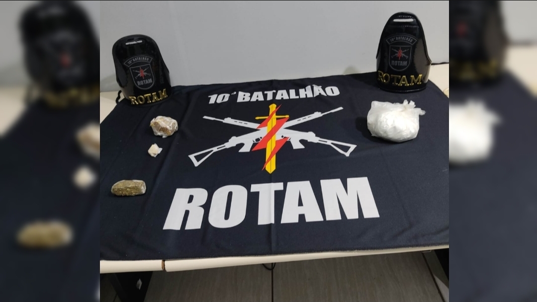 Em buscas no ambiente, os policiais localizaram, sob um tambor, uma camiseta enrolada contendo porções de cocaína, crack e maconha.