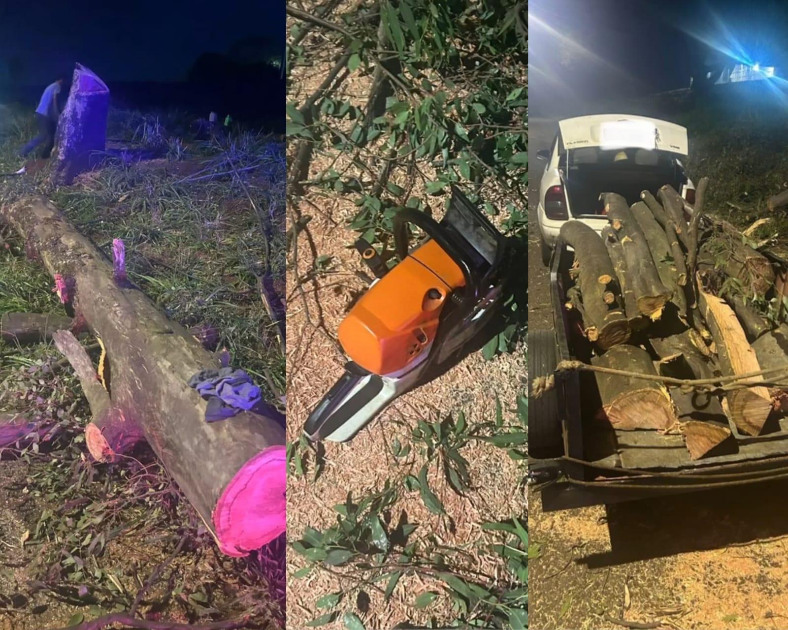 De acordo com informações da GCM, a equipe foi acionada pela Central de Comunicações (CCO) após uma denúncia de supressão irregular de vegetação em área pública. Ao chegarem ao local, os agentes encontraram o homem utilizando uma motosserra para cortar um eucalipto. A árvore já havia sido totalmente derrubada, e parte dos galhos e do tronco estavam sendo carregados em uma carretinha acoplada a um veículo branco.