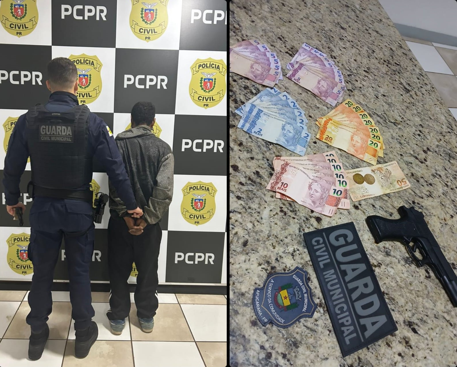 Um homem de aproximadamente 50 anos foi preso na madrugada desta quarta-feira (27), após assaltar duas farmácias na região central de Apucarana. A ação rápida da Guarda Civil Municipal (GCM) resultou na captura do suspeito, que usava um simulacro de arma de fogo para ameaçar os funcionários durante os crimes.