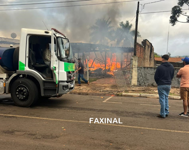Um incêndio de grandes proporções destruiu completamente uma residência na manhã desta segunda-feira (3), em Faxinal. O imóvel, localizado em frente ao Colégio São Domingos, era de madeira e estava alugado pela empresária Lucineide Gonçalves, proprietária da Lucy Locações, empresa conhecida na região pelo trabalho com decoração e locação de materiais para festas e eventos.