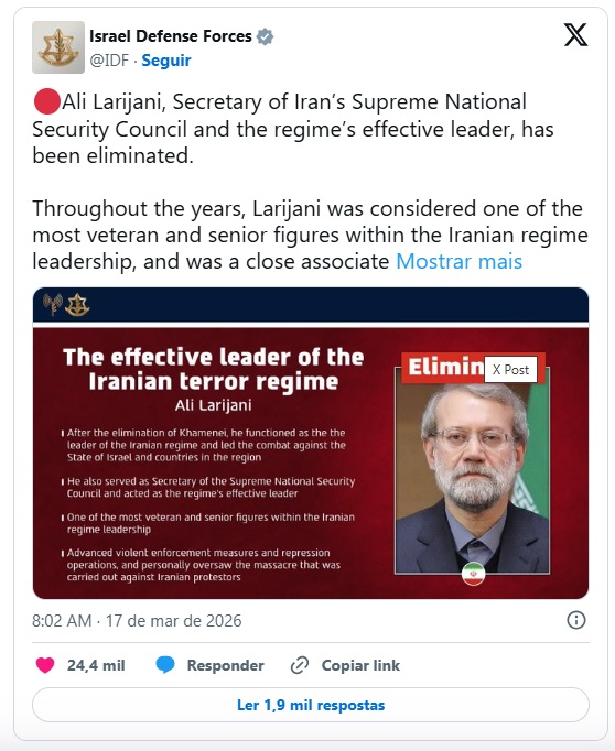 Até a última atualização, Teerã não havia confirmado as mortes. A mídia estatal iraniana divulgou uma nota manuscrita atribuída a Larijani, mas não comentou diretamente as declarações feitas por Israel.