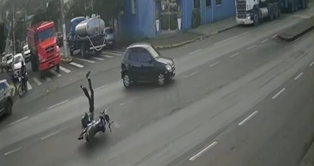 Câmeras de segurança registraram o momento exato da colisão. Nas imagens, é possível ver o motociclista sendo arremessado após o impacto. Ele chega a dar uma pirueta no ar antes de cair com força no asfalto.