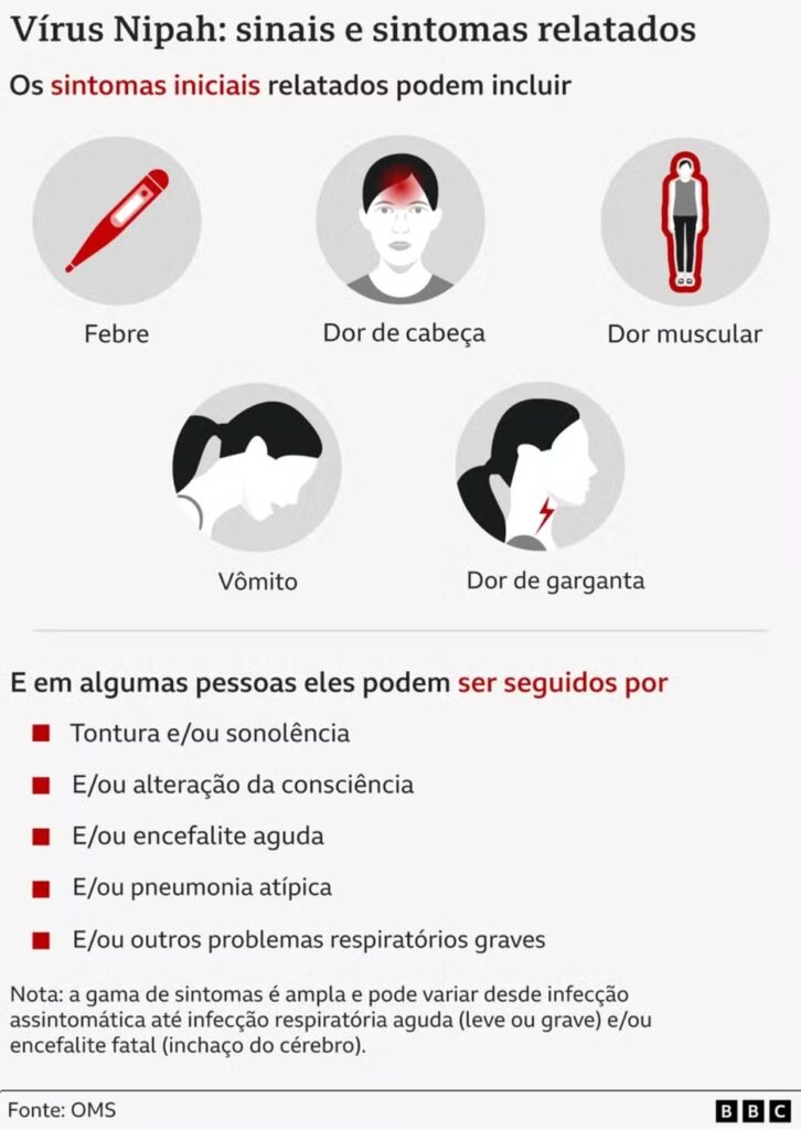 O Nipah é um vírus zoonótico, capaz de ser transmitido de animais — como morcegos frugívoros e porcos — para humanos, além de permitir a disseminação entre pessoas. A infecção pode provocar quadros de insuficiência respiratória aguda e encefalite, inflamação grave do cérebro. Atualmente, não existe vacina nem tratamento específico, e a taxa de letalidade pode chegar a 75%.