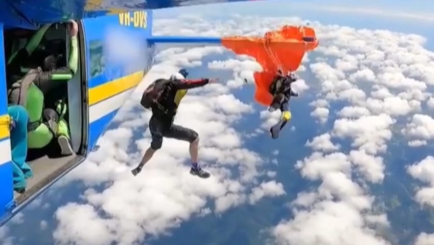 No entanto, logo após o primeiro salto, a alça do paraquedas reserva de um atleta ficou presa em uma aba da asa. As imagens mostram o momento em que o equipamento se abre acidentalmente, deixando o paraquedista pendurado no ar.