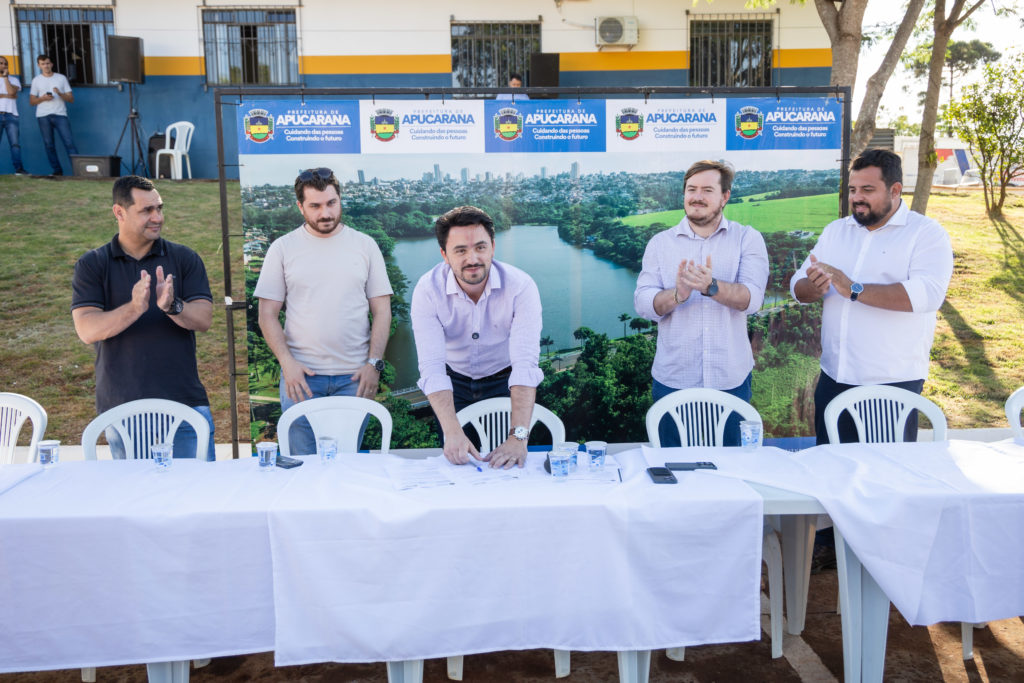 O prefeito Rodolfo Mota autorizou nesta quinta-feira (27/12) o início das obras de construção do refeitório e área de repouso destinada aos servidores municipais lotados na Secretaria de Serviços Públicos. A ordem de serviço foi assinada em evento no pátio de máquinas da Prefeitura de Apucarana. O início dos trabalhos está previsto para o dia 5 de janeiro, com prazo de 10 meses para conclusão. A licitação, vencida pela Construtora Canterteze Ltda, de Arapongas, prevê investimento na ordem de R$ 994.999,90 em recursos municipais. Além de membros do secretariado municipal, prestigiou o ato o vereador Pablo da Segurança.