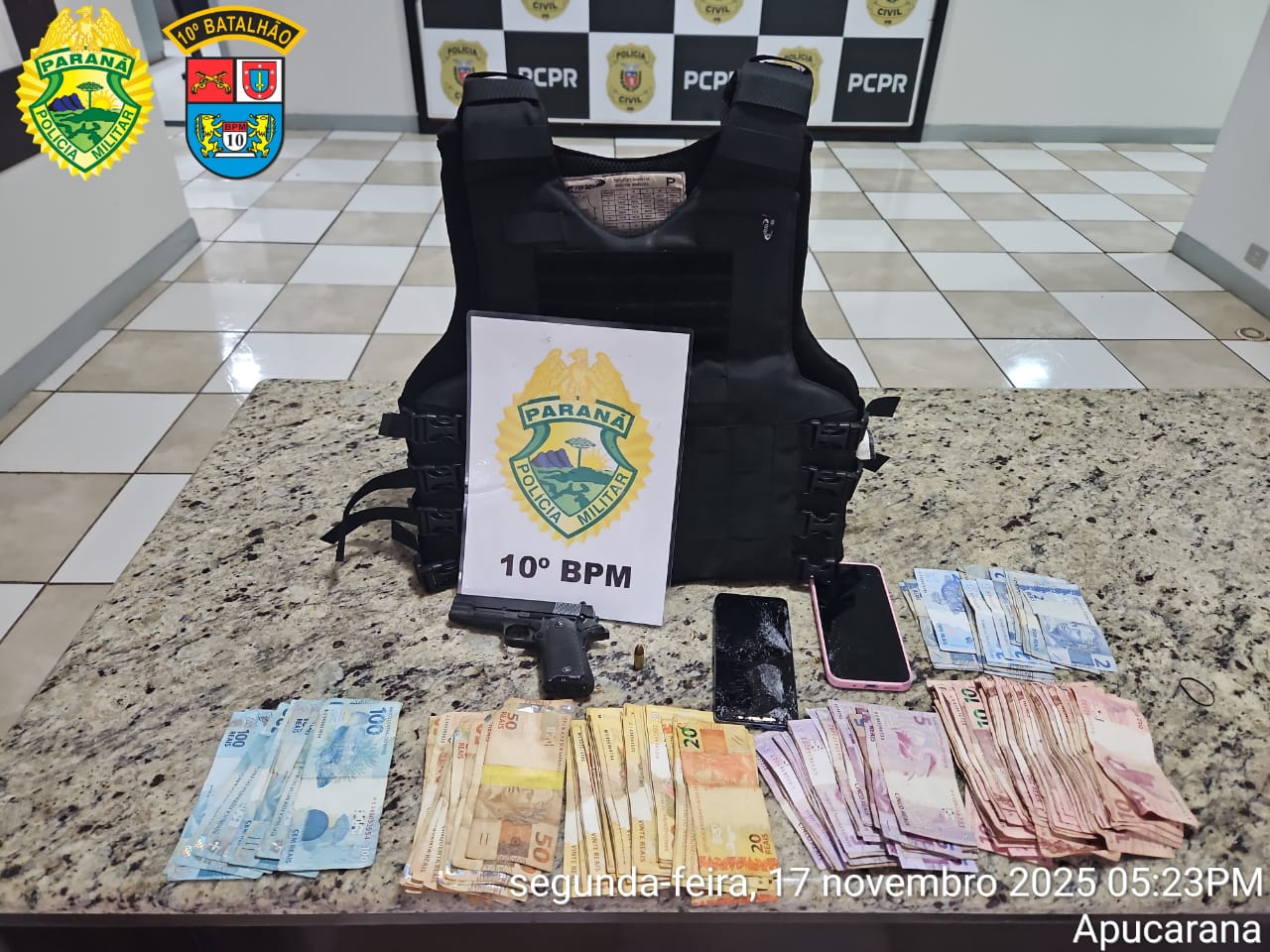 Uma ação da Polícia Militar na tarde desta segunda-feira (17) resultou no cumprimento de um mandado de prisão e na apreensão de diversos materiais, incluindo munição e um colete balístico, em uma residência no Residencial Sumatra I, em Apucarana.