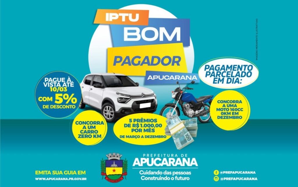 A Prefeitura de Apucarana prorrogou o prazo para pagamento do Imposto sobre a Propriedade Predial e Territorial Urbana (IPTU) 2026. Agora, os contribuintes têm até o dia 20 de março para quitar a primeira parcela ou efetuar o pagamento em cota única, com desconto de 5%.