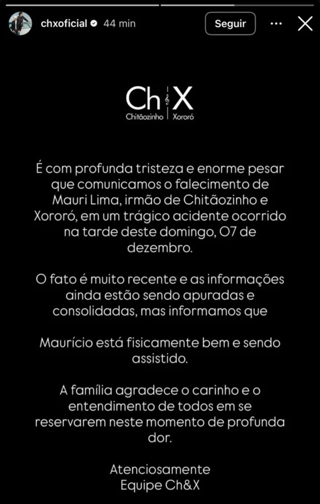 “É com profunda tristeza e enorme pesar que comunicamos o falecimento de Mauri Lima, irmão de Chitãozinho e Xororó, em um trágico acidente ocorrido na tarde deste domingo, 7 de dezembro. O fato é muito recente e as informações ainda estão sendo apuradas e consolidadas, mas informamos que Maurício está fisicamente bem e sendo assistido.