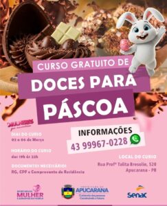 A Secretaria da Mulher e Assuntos da Família de Apucarana, em parceria com o Senac, está com inscrições abertas para dois cursos gratuitos e exclusivos para mulheres a partir de 16 anos.